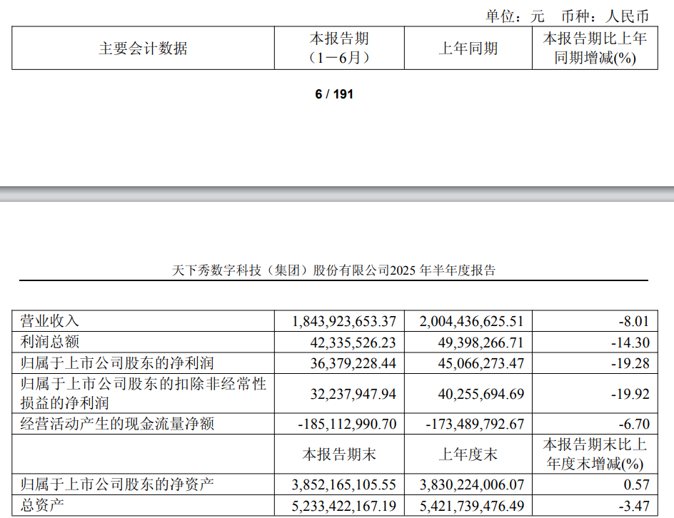天下秀2025年半年报主要财务指标