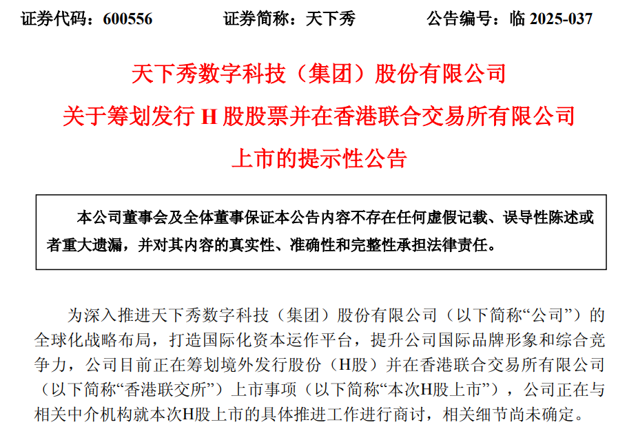 “困则思变”,A股“网红第一股”天下秀(600556)8月底公告,为深入推进公司的全球化战略布局,打造国际化资本运作平台,提升公司国际品牌形象和综合竞争力,公司目前正在筹划境外发行股份(H股)并在香港联交所上市事项,公司正在与相关中介机构就本次H股上市的具体推进工作进行商讨,相关细节尚未确定。